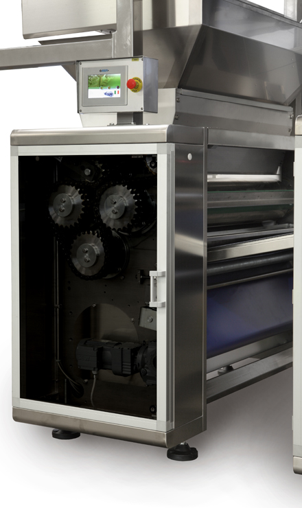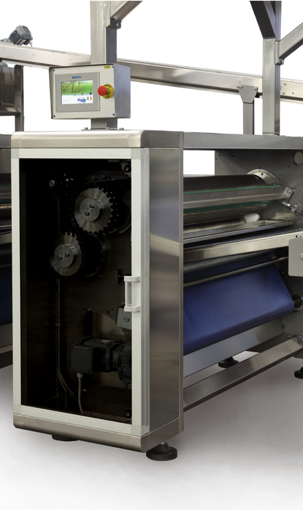 forming station composed by 3 (or 4) cylinders for the creation of the dough sheet: an hopper receives the dough and a continuous sheet of approx. 10 mm is created when the dough passes between the cylinders. A conveyor belt brings the dough to the following sheeting station